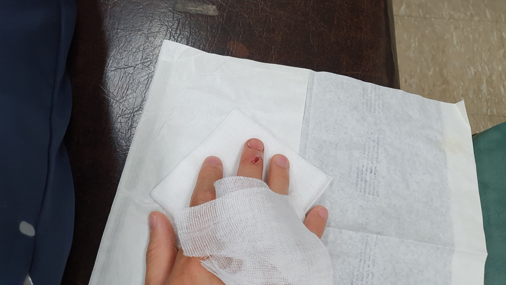 피가 철철 흐르는 와중에도 얼른 손가락 마디를 움직여 보았다. 찔린 위치가 펴는 힘줄에 가까워 혹시나 하는 걱정이 들었다. 다행히 이상이 없었다. 우선 이에 안도했다. 힘줄을 다치면 재활도 해야 하고 여러모로 골치가 아프다. 그 후 다친 손가락 주변을 만져 감각을 확인해 보았다. 감각이 살아 있는 걸 보니 신경도 다치지 않은 듯했다. 찔린 위치상 신경, 동맥은 신경 쓰지 않아도 될 듯했다. 그래도 깊이 찔린 것 같았다. 좌우로 벌어진 상처로 꽤 많은 피가 흘러나왔는데 쉽게 지혈이 되지 않았다. 아무래도 피하 정맥을 벤 것 같았다. 찔린 부위가 인대와 가까웠는데 인대 손상 여부는 확인할 수가 없었다. 하지만 힘줄이 손상되지 않을 걸 보면 인대도 다치지 않았을 거란 생각이 들었다. 깊게 찔렸는데 그나마 운이 좋았다.